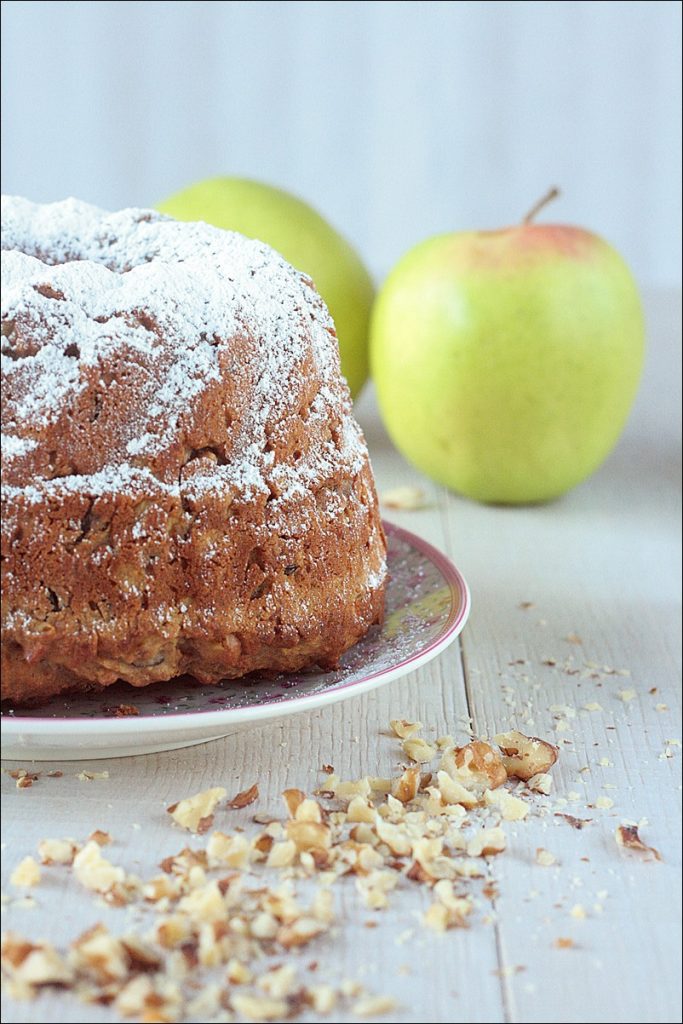 Setacciate le farine e il lievito in polvere, tritate le noci e grattugiate la mela privata di torsolo e buccia.
