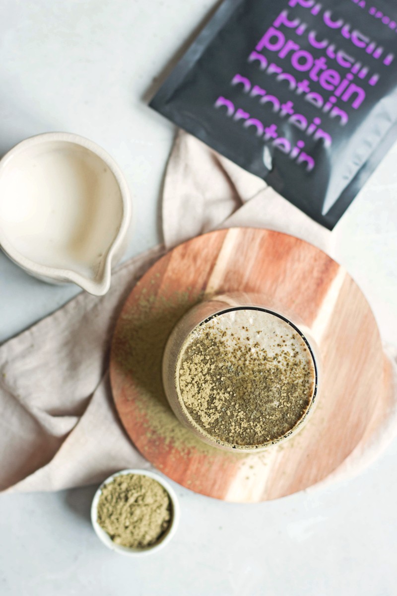 Scaldo la bevanda vegetale di mandorle fatta in casa nel montalatte. In una tazza, mescolo 1 cucchiaino di tè matcha in polvere con le proteine vegane FRESCHE. Aggiungo il latte caldo montato per una bevanda vellutata.