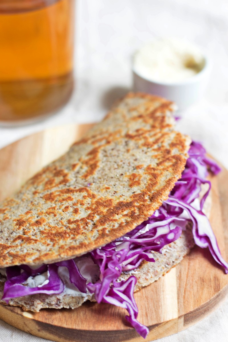 Mescolo la farina di mandorle, i semi di chia, i semi di lino macinati, lo yogurt greco 10% e la 1/2 bustina di proteine vegane FRESCHE. Formo un panetto, lo stendo tra due fogli di carta forno e ricavo due dischi. Cuocio su piastra 2 minuti per lato.